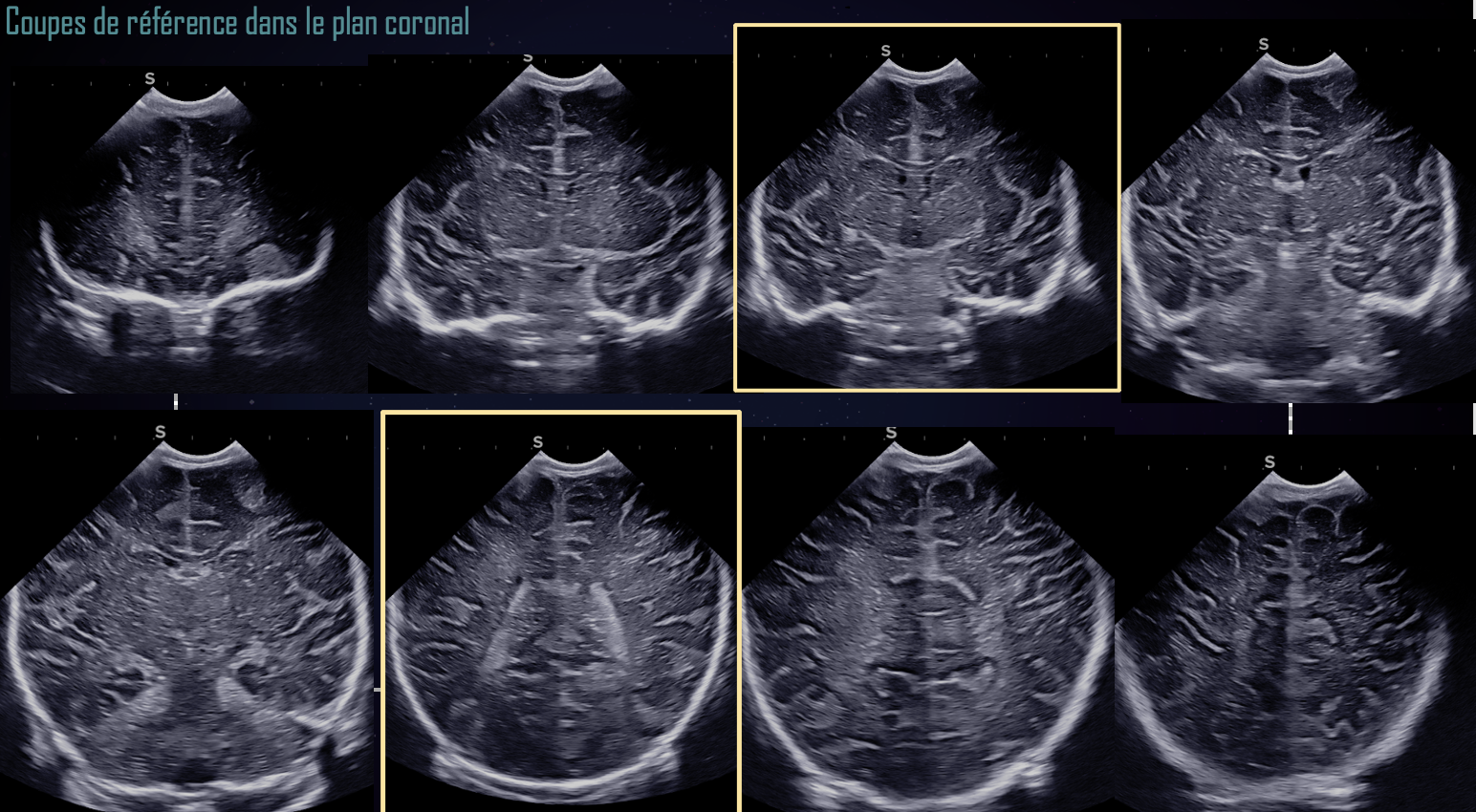 En coupes frontales, le balayage va des lobes frontaux, au-dessus des orbites, jusqu’à la limite de visibilité du parenchyme permise par la fenêtre échographique, en arrière des plexus choroïdes. Au minimum, trois coupes frontales de référence sont nécessaires : antérieure, médiane et postérieure :
