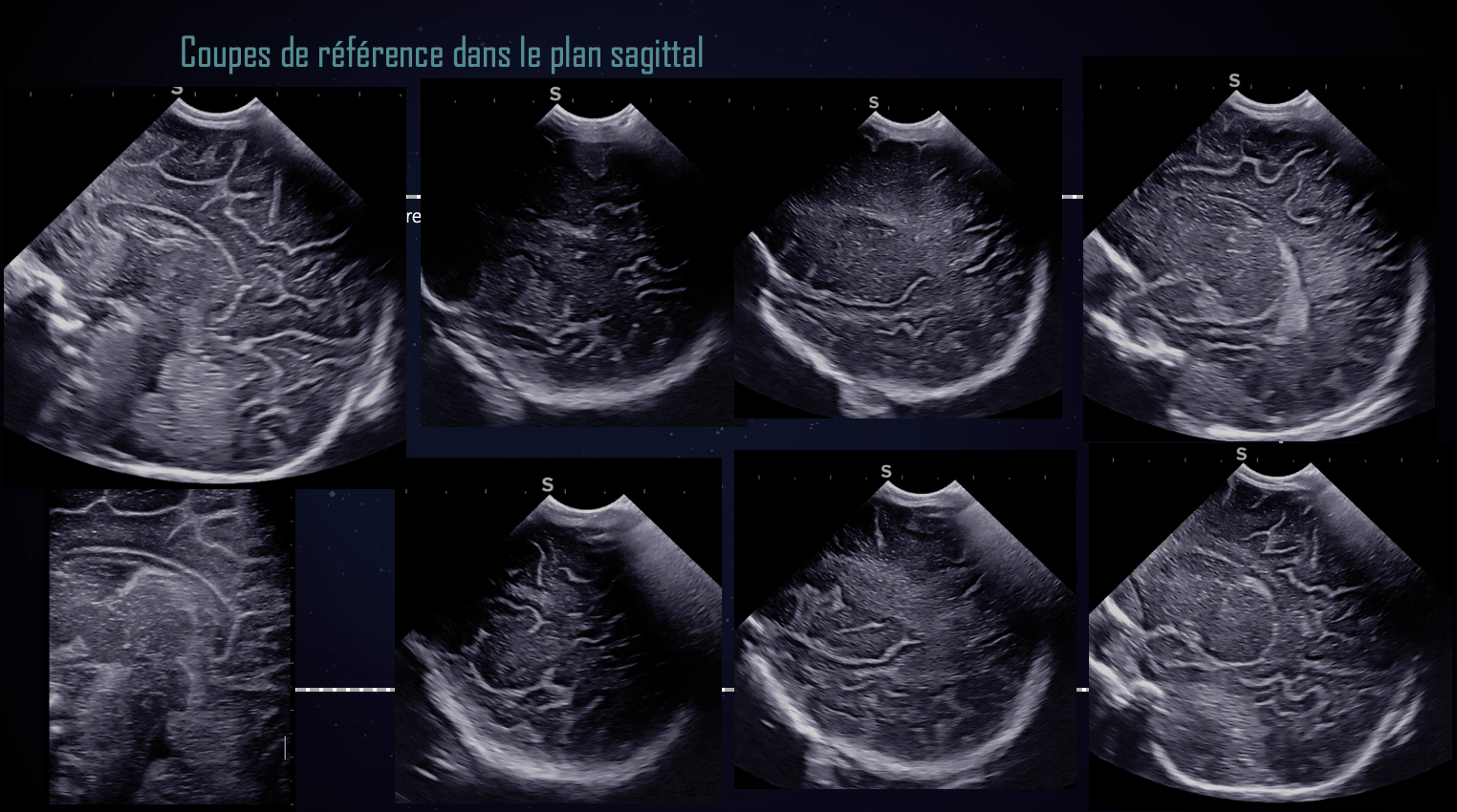 Pour acquérir les coupes sagittales, le balayage va d’une vallée sylvienne à l’autre. Au minimum, trois coupes de référence sont nécessaires : médiane, sagittales paramédiane droite et gauche :